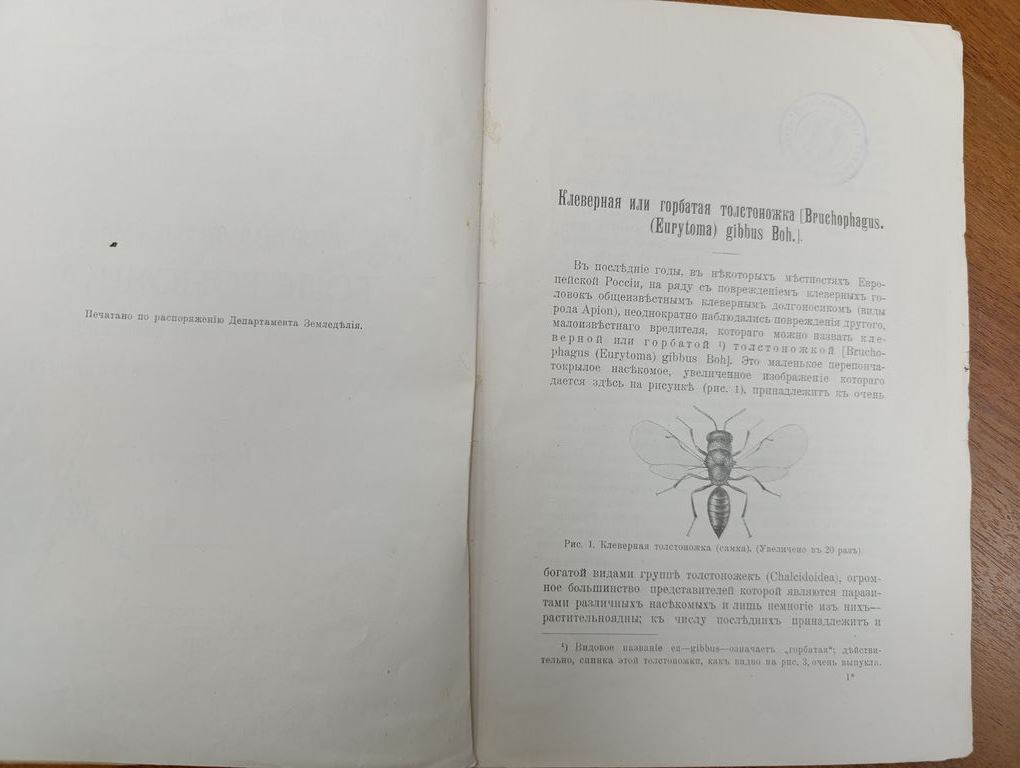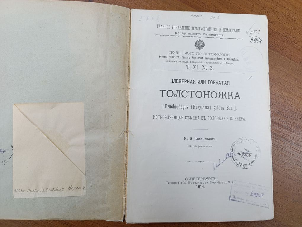 Клеверная или горбатая толстоножка Bruchophagus Eurytoma gibbus Boh.), истребляющая семена в головках клевера / И.В. Васильев. - Санкт-Петербург : тип. М. Меркушева, 1914. - 12 с. С 6 рис.; 25. - (Главное управление землеустройства и земледелия. Департамент земледелия. Труды Бюро по энтомологии Ученого комитета Главного управления землеустройства и земледелия, издаваемые под редакцией заведующего Бюро; Т. 11, № 3).