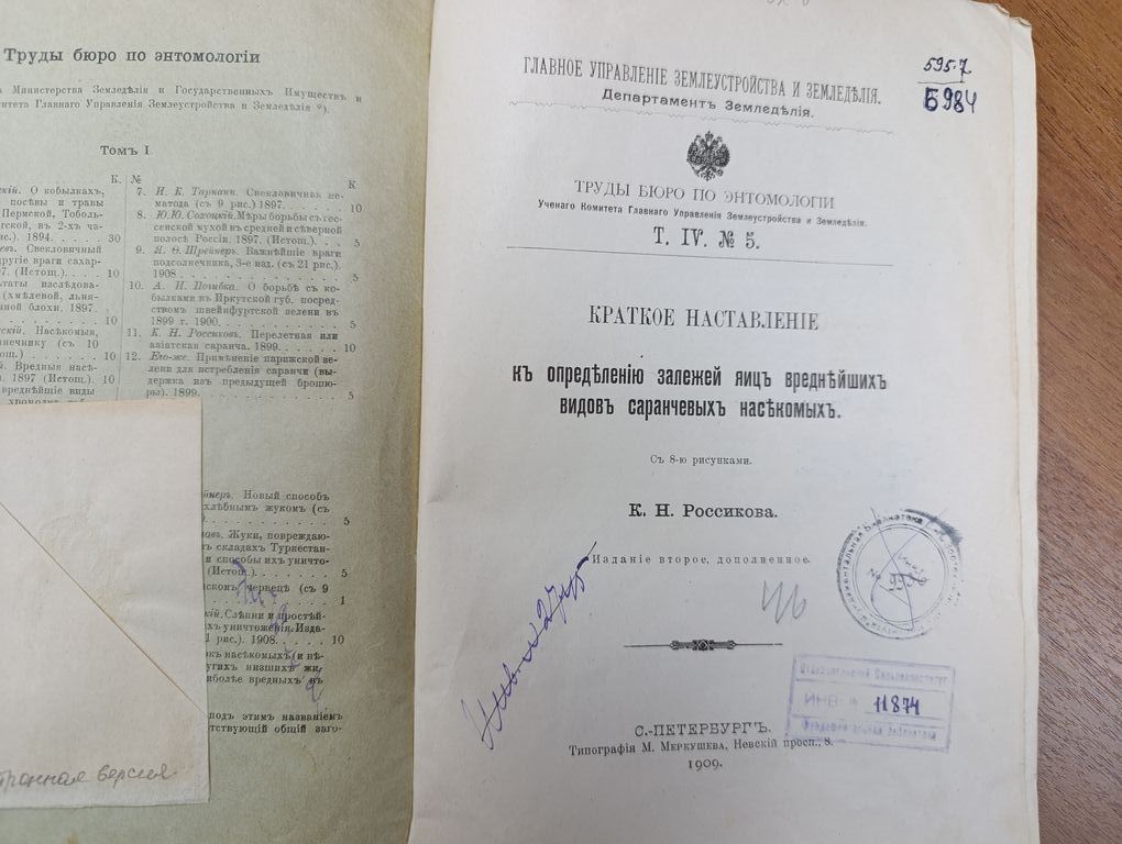 Краткое наставление к определению залежей яиц вреднейших видов саранчевых насекомых / [Соч.] К.Н. Россикова. - 2-е изд., доп. - Санкт-Петербург : тип. М. Меркушева, 1909. - 16 с., 8 ил.; 24. - (Главное управление землеустройства и земледелия. Департамент земледелия. Труды Бюро по энтомологии Ученого комитета Главного управления землеустройства и земледелия; Т. 4, № 5).