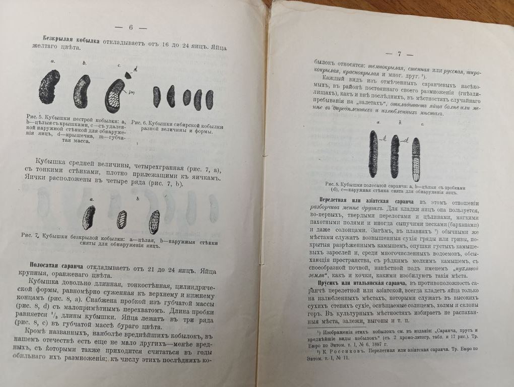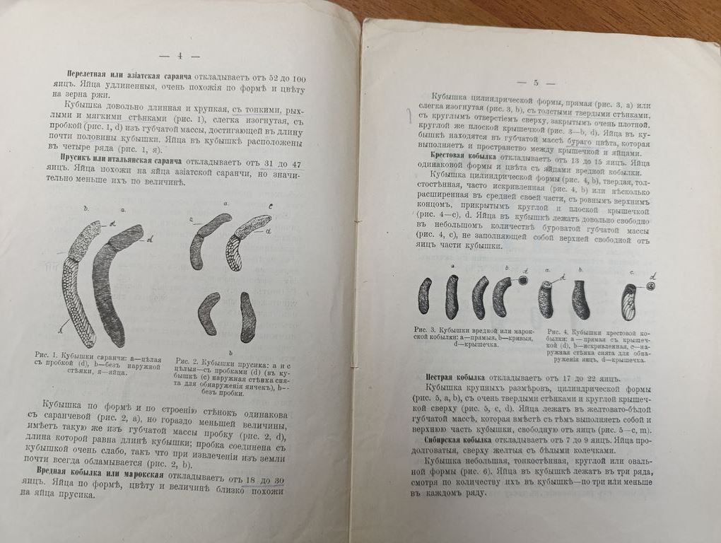 В издании К. Н. Россикова «Краткое наставление к определению залежей яиц вреднейших видов саранчевых насекомых» (2‑е изд., доп., 1909) представлено практическое руководство по выявлению и идентификации мест откладки яиц наиболее опасных видов саранчовых, представляющих угрозу сельскохозяйственным угодьям. В работе систематизированы сведения о характерных признаках и типичных местах расположения залежей яиц различных видов саранчи, описаны методы их обнаружения и диагностики. Автор даёт чёткие рекомендации по проведению обследований территорий, позволяющих своевременно выявить потенциальные очаги массового размножения вредителей. Издание дополнено 8 иллюстрациями, наглядно демонстрирующими особенности залежей яиц и помогающими в их распознавании на практике.