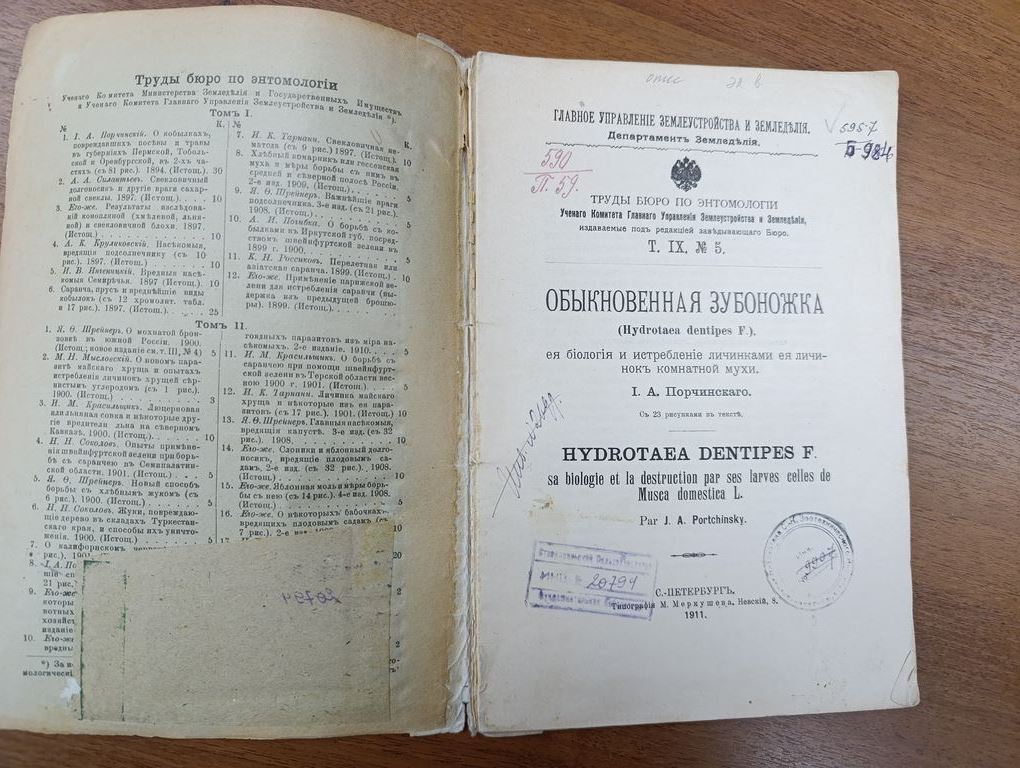 Обыкновенная зубоножка Hydrotaea dentipes F., ее биология и истребление личинками ее личинок комнатной мухи / [Соч.] И.А. Порчинского. - Санкт-Петербург : тип. М. Меркушева, 1911. - 30 с. : ил.; 24. - (Главное управление землеустройства и земледелия. Департамент земледелия. Труды Бюро по энтомологии Ученого комитета Главного управления землеустройства и земледелия, издаваемые под редакцией заведующего Бюро; Т. 9, № 5).