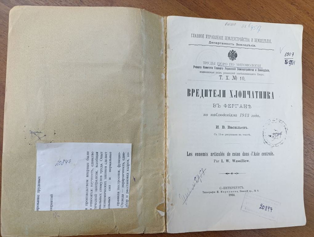 Вредители хлопчатника в Фергане по наблюдениям 1913 года : С 13 рис. в тексте / И.В. Васильев. - Санкт-Петербург : тип. М. Меркушева, 1914. - 24, 4 с.; 24. - (Главное управление землеустройства и земледелия. Департамент земледелия. Труды Бюро по энтомологии Ученого комитета Главного управления землеустройства и земледелия, издаваемые под редакцией заведующего Бюро; Т. 10, № 10).
