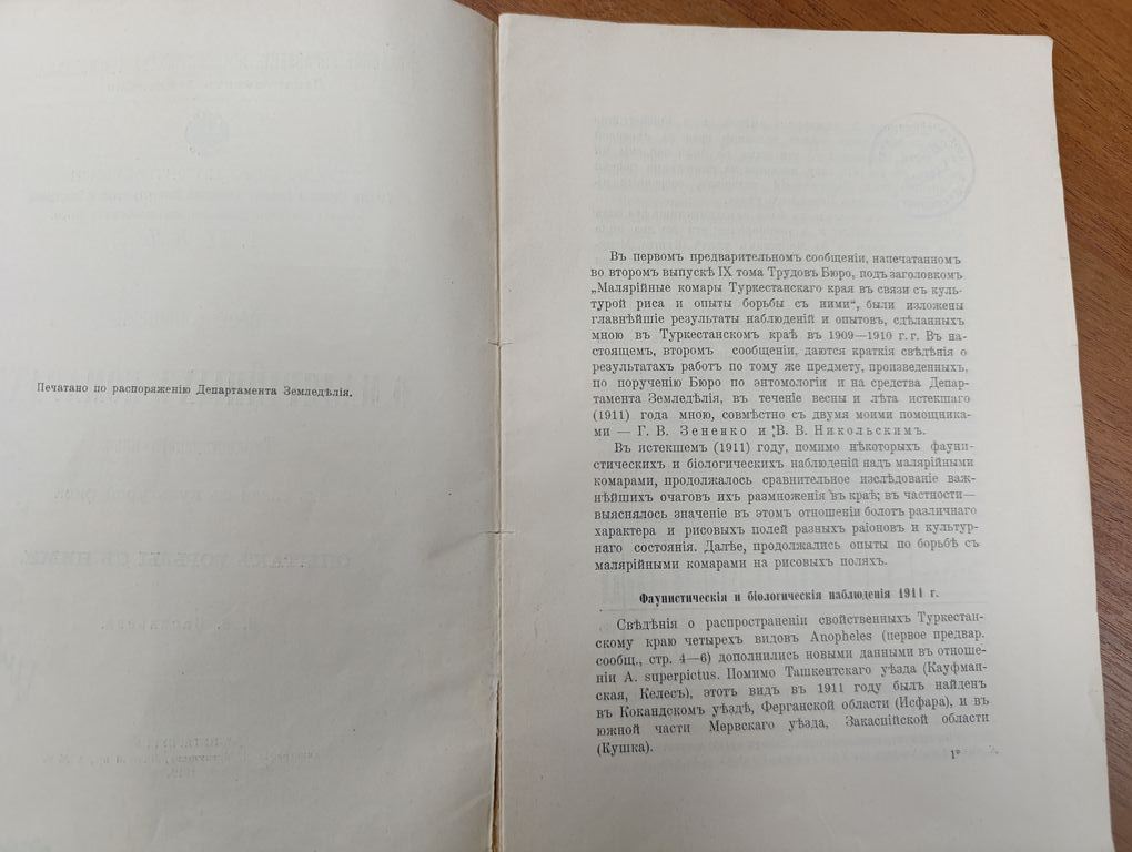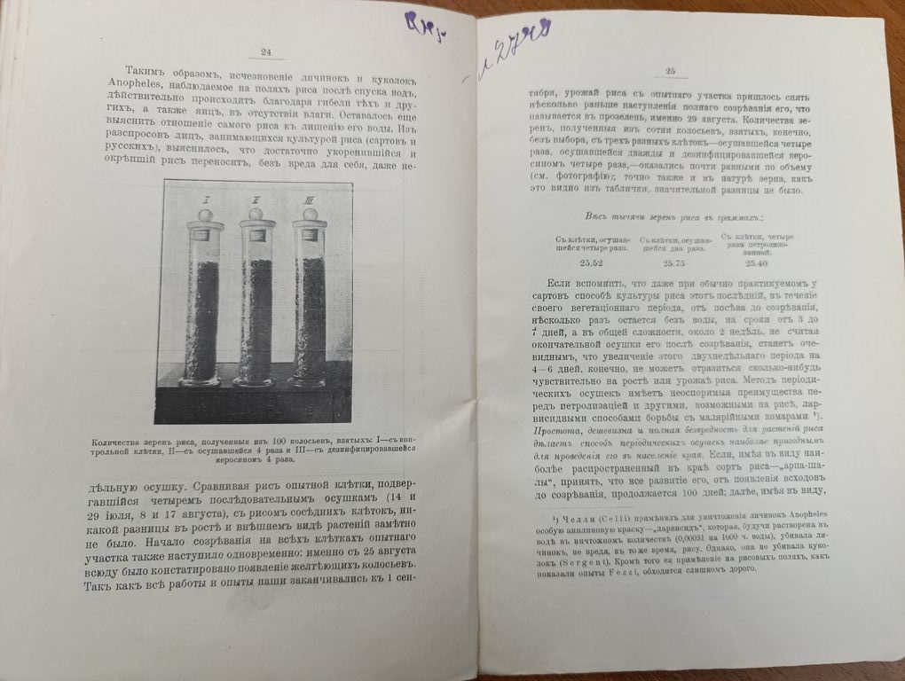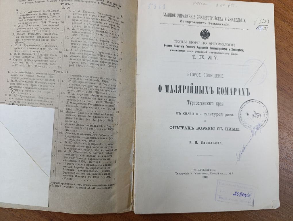Второе сообщение о малярийных комарах Туркестанского края в связи с культурой риса и опытах борьбы с ними / [Соч.] И.В. Васильева. - Санкт-Петербург : тип. М. Меркушева, 1912. - 26 с. : ил. и табл.; 24. - (Главное Управление землеустройства и земледелия. Департамент земледелия. Труды Бюро по энтомологии Ученого комитета Главного Управления землеустройства и земледелия, издаваемые под редакцией заведующего Бюро; Т. 9, № 7).