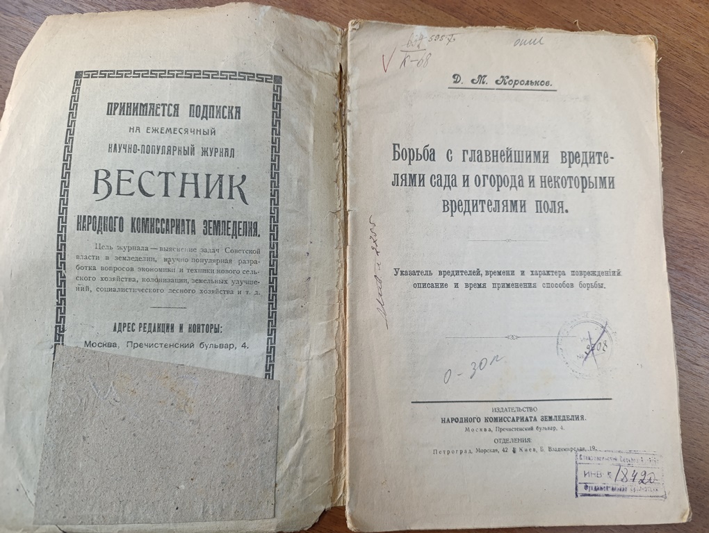 Борьба с главнейшими вредителями сада и огорода и некоторыми вредителями поля : указатель вредителей, времени и характера повреждений, описание и время применения способов борьбы / Д. М. Корольков. - Москва : [Нар. ком. земледелия], 1919. - 32 с.; 24 см. - (Библиотека сельского хозяйства Советской России).