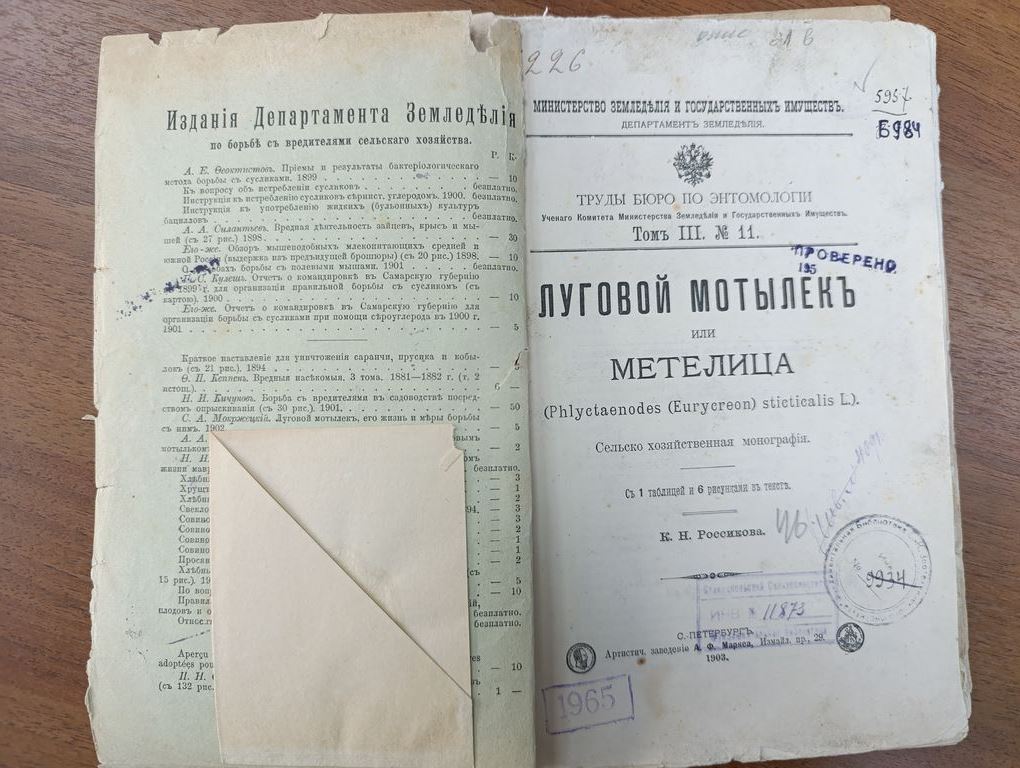 Луговой мотылек или метелица : Луговой мотылек или метелица : (Phlyctaenodes (Eurycreon) sticticalis L.) : С.-х. монография / [Соч.] К.Н. Россикова. - Санкт-Петербург : артист. заведение А.Ф. Маркса, 1903. - 95, [2] с., 6 ил., 1 л. цв. ил.; 24. - (Министерство земледелия и государственных имуществ. Департамент земледелия. Труды Бюро по энтомологии Ученого комитета Министерства земледелия и государственных имуществ; Т. 3, № 11).
