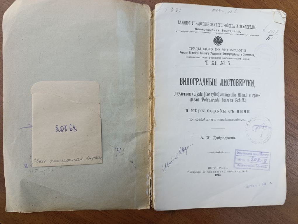 Добродеев, А.И. Виноградные листовертки, двулетняя (Clysia Cochylis ambiguella Huebn.) и гроздевая (Polychrosis botrana Schiff.) и меры борьбы с ними по новейшим исследованиям / А.И. Добродеев // Труды бюро по энтомологии Ученого Комитета Главного Управления Землеустройства и Земледелия. – Петроград: Типография М. Меркушева. Невский пр. № 8, 1915. – Т. XI, № 5. – 42 с.